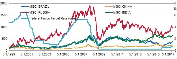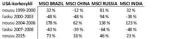 Oheisessa kuvassa on esitetty MSCI:n Brasilia, Kiina, Venäjä ja Intia –pörssi-indeksit euromääräisinä. Vuosien 1999-2000 koronnostosylin aikana BRIC-maista kaikki muut paitsi Kiina nousivat. Koronlaskuissa 2000-2003 kaikki muut paitsi Venäjä laskivat. Korkojen noustessa 2004-2006 kaikien BRIC-maiden pörssit nousivat vahvasti. Finanssikriisin aikana 2007-2008 korkoja laskettiin voimakkaasti ja samalla osakemarkkinat laskivat voimakkaasti. Nykyisessä korkosyklissä FED nosti korkoa ensimmäisen kerran vuoden 2015 lopussa. Sen jälkeen kaikkien BRIC- markkinoiden pörssit ovat olleet nousussa.